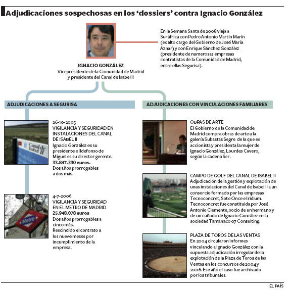 Una empresa pública que dirige el vicepresidente de la Comunidad de Madrid, Ignacio González, adjudicó un contrato por importe de 33,4 millones de euros a la empresa Segurisa, cuyo propietario invitó presuntamente a González a un viaje a Suráfrica. El número dos de Esperanza Aguirre reconoce que el viaje se produjo en marzo de 2007, pero asegura que lo pagó "en metálico" de su bolsillo.